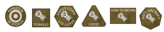 includes two Ranged In tokens, four Foxholes tokens, eight Pinned Down tokens, one Leader token, four Gone To Ground tokens and one Anti-Aircraft token.