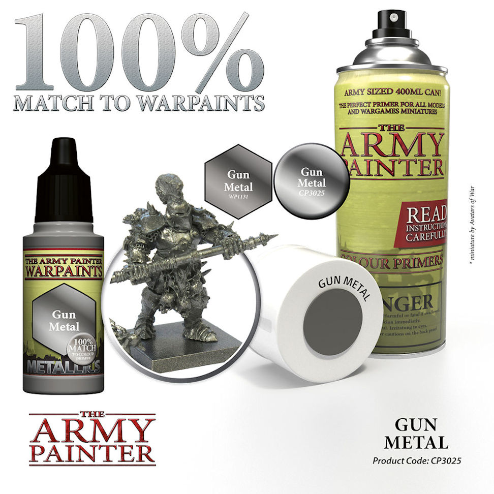 The Gun Metal is a rich and dark metal and is nothing but the perfect basecoat for vehicles of all ages, Knights and dark Sci-Fi & Fantasy. As the Gun Metal spray is part of the Colour Primers, it has a matt surface and works perfect with the other Warpaint acrylic colurs from The Army Painter. The Warpaints: Gun Metal is a 100% match to the new spray so touch up’s and over-painting has never been easier. For shading, we recommend the Quickshade: DARK Tone or the acrylic Warpaints of the same name.