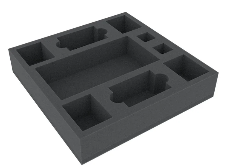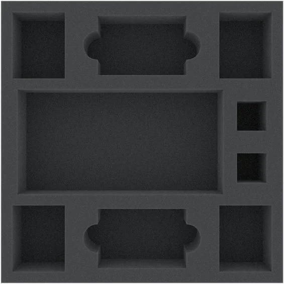 Foam tray for the Mansions of Madness Sanctum of Twilight. The tray provides a great solution for protecting all figures, tokens and cards in sleeves from the original board game box. There is an additional 10 mm foam topper to protect the Sanctum of Twilight figures.