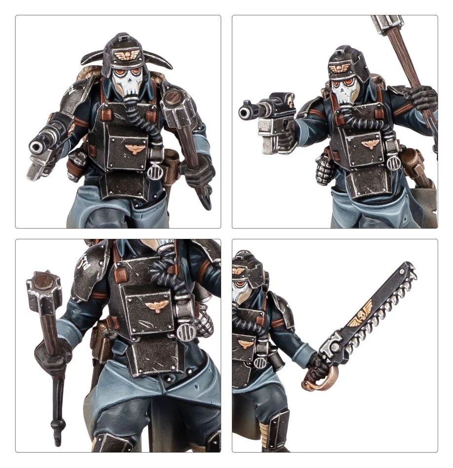 The kit comes with lots of options, making it easy to customise the look of your miniatures, and ensure they have the right tools for any mission. Each Combat Engineer can be built armed with a combat shotgun, or an autopistol and a trench club. Alternatively, one can be armed with a flamer, and one equipped with a remote mine controller. Finally, one can be built as a Watchmaster who can be armed with a bolt pistol, autopistol, plasma pistol, hand flamer, or combat shotgun, and a chainsword, power weapon, trench club, or grenade.