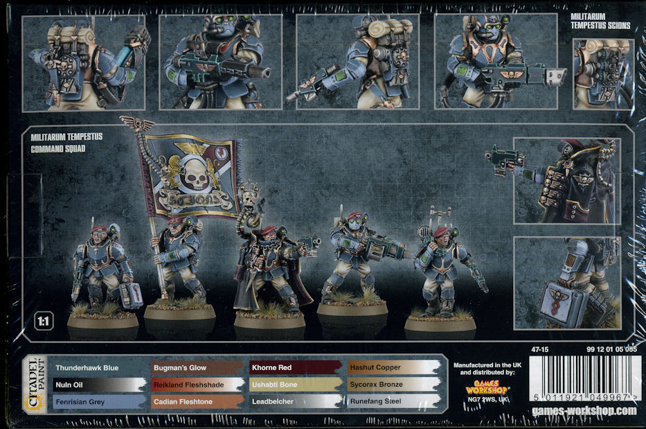 Tempestus Scions är bland de bästa mänskliga krigarna i galaxen. De är följer order fanatiskt - även om det innebär deras säkra död - och slutför uppdrag så farliga att de skulle klassas som självmordsuppdrag av vanliga soldater. Denna förpackning innehåller allt du behöver för att sätta upp en 5-mans enhet Militarum Tempestus Scions beväpnade med Hot-shot Lasguns eller en 5-mans enhet Militarum Tempestus Command Squad. För att göra dina figurer personliga har du bland annat 10 olika huvud (5 med gasmask och 5 med basker), ammunitionspåsar, knivar, granater och fältflaskor. Om du väljer att bygga enheten som Tempestus Scions kan du uppgradera en figur till Tempestor, som har ett stort utbud av vapen att välja på: Powerfist, Chainsword, Power Sword för höger hand samt Laspistol, Bolt pistol eller Plasma pistol för vänster. Du kan även byta ut Lasguns mot ytterligare fem specialvapen: Plasma gun, Meltagun, Grenade Launcher, Flamer eller Hot-shot Volley gun. Förpackningen innehåller även en vox-caster ryggsäck som du kan använda för att bygga om en figur till Vox-cast operatör. Kräver montering och målning, Verktyg, lim, färg och penslar mm ingår ej men kan köpas i vårt tillbehörs-sortiment.