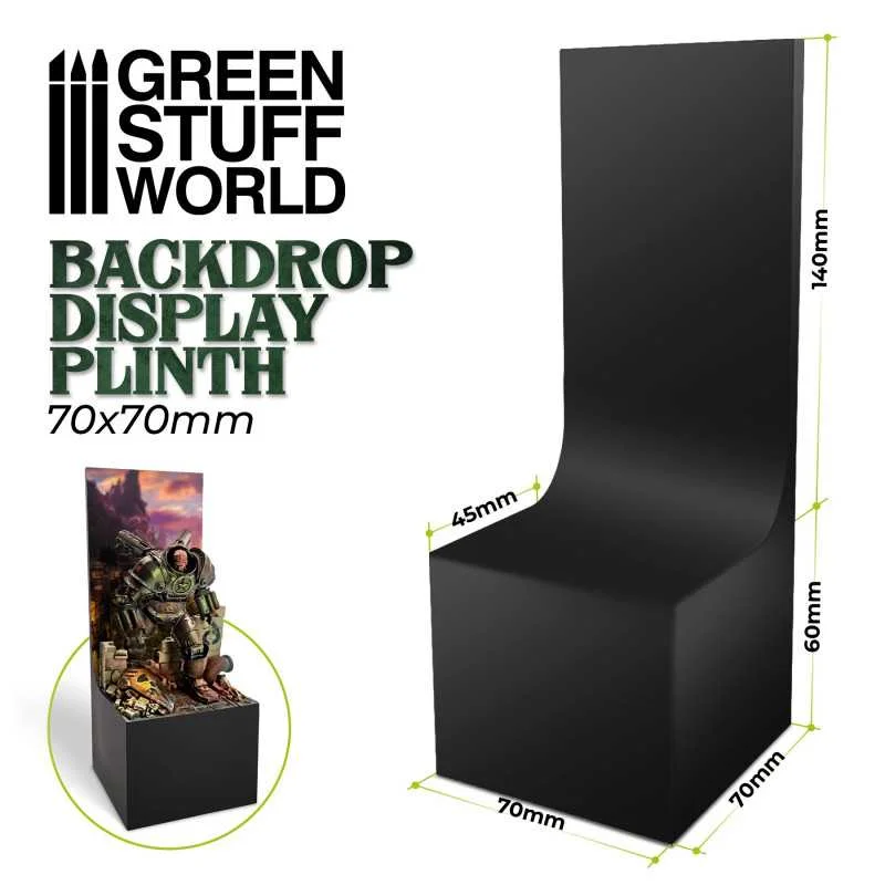 Backdrop display plinths bring another dimension to the figure and miniature displays. The curved backdrop is perfect to unify the base background with the figure. These are essential plinths for displaying your figures or miniatures. Colour: Black lacquered Material: MDF wood Dimensions: 7x7x6+14cm