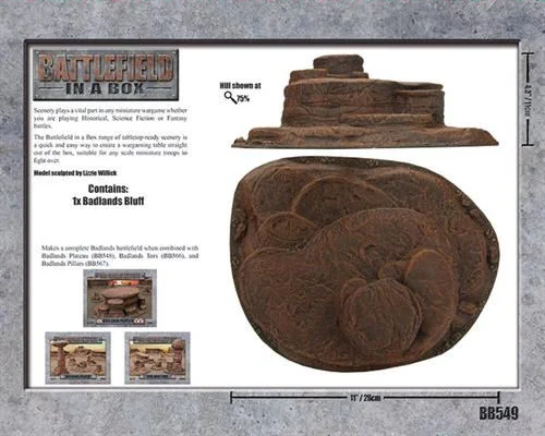 The massive Badlands Bluff is a towering feature with broad flat steppes which allow your forces to control every area of the rock formation. The different elevations of the formation allow you to take the high ground or duck behind cover. The top of the bluff is broad enough for multiple models while still offering the cover of smaller formations. The main elevation is 3 inches high with formations that peak at 4¼ inches, the entire formation covers an area 11 inches long by 8½ wide.
