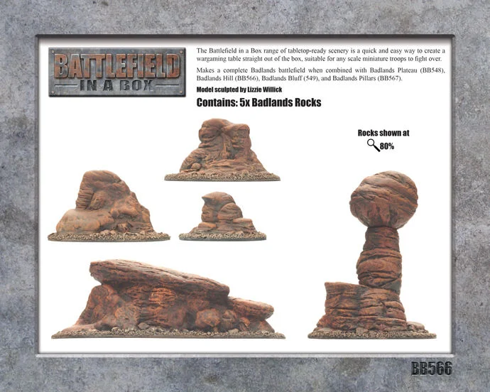 Gale Force Nines Battlefield in a Box Badlands sets enable you to create a new landscape for your miniature wargame battles, from the stunning vistas of the American Old West, to the desert canyons of Northern Africa, to arid alien worlds in far-flung galaxies. These new terrain pieces were sculpted by Gale Force Nines Lizzie Willick. Each piece is pre-painted and ready for your battles right out of the box. These terrain pieces work for any scale of miniature combat. Will your forces dare to cross into Badlands?