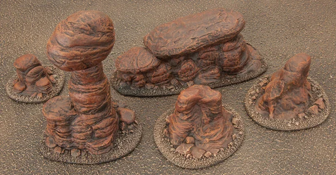 The massive Badlands Bluff is a towering feature with broad flat steppes which allow your forces to control every area of the rock formation. The different elevations of the formation allow you to take the high ground or duck behind cover. The top of the bluff is broad enough for multiple models while still offering the cover of smaller formations. The main elevation is 3 inches high with formations that peak at 4¼ inches, the entire formation covers an area 11 inches long by 8½ wide.