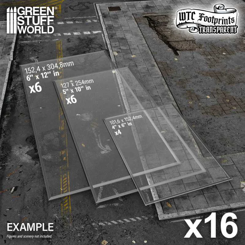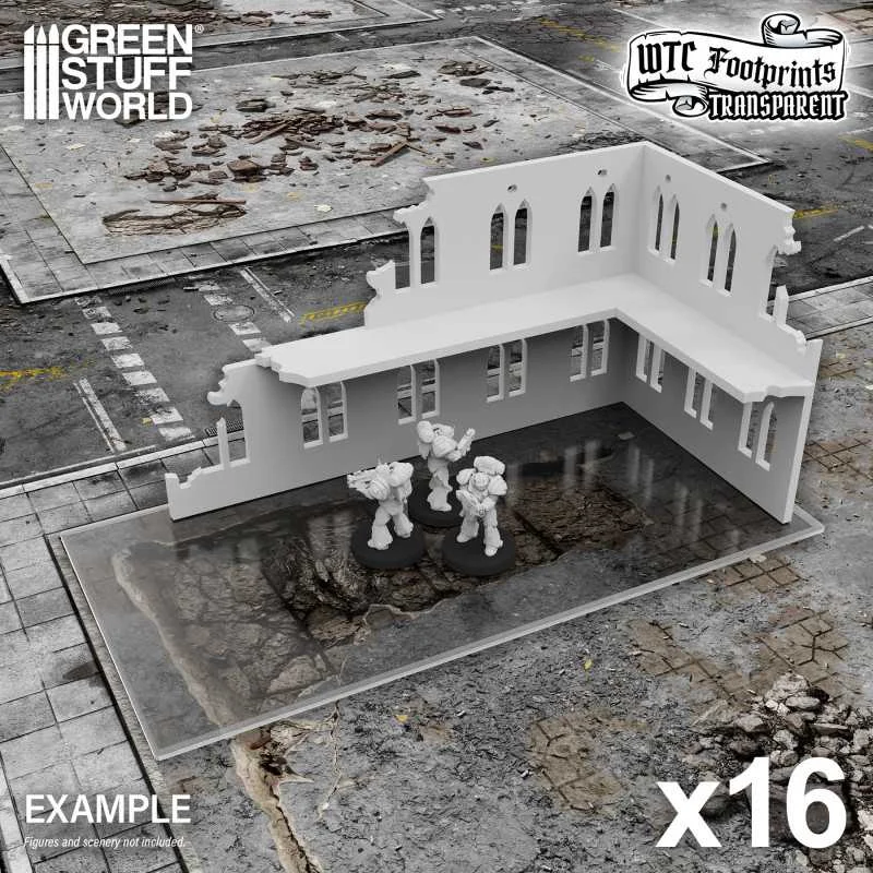 Green Stuff World's glasspack footprints are transparent 1 mm bases that precisely mark the footprint of buildings and ruins for games compatible with Warhammer 40,000® and WTC events. Made from fully transparent, flexible, and unbreakable glasspack plastic, they preserve your gaming mat’s aesthetics and won’t create edges that trip up your models.