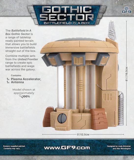 The Battlefield In A Box Gothic Sector is a range tabletop ready painted terrain that allows you to build immersive battlefields straight out of the box. Combine multiple sets from the United Frontier range to create epic battlefields and wage war across the galaxy. Contains: 1x Plasma Accelerator and 1x Antenna