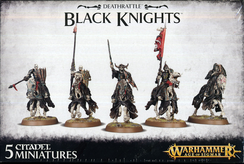 This multi-part plastic boxed set contains 91 components with which to make 5 Black Knights, carrying crypt shields and wielding barrow lances. One model can be assembled as a Hell Knight, leader of the unit, and two can be assembled as a standard bearer and hornblower respectively.
