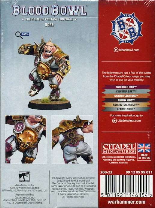 This multi-part plastic kit contains the components necessary to assemble a Blood Bowl Ogre. He comes supplied with a 32mm Blood Bowl round base, featuring a hole to slot the ball into when your miniature has possession.