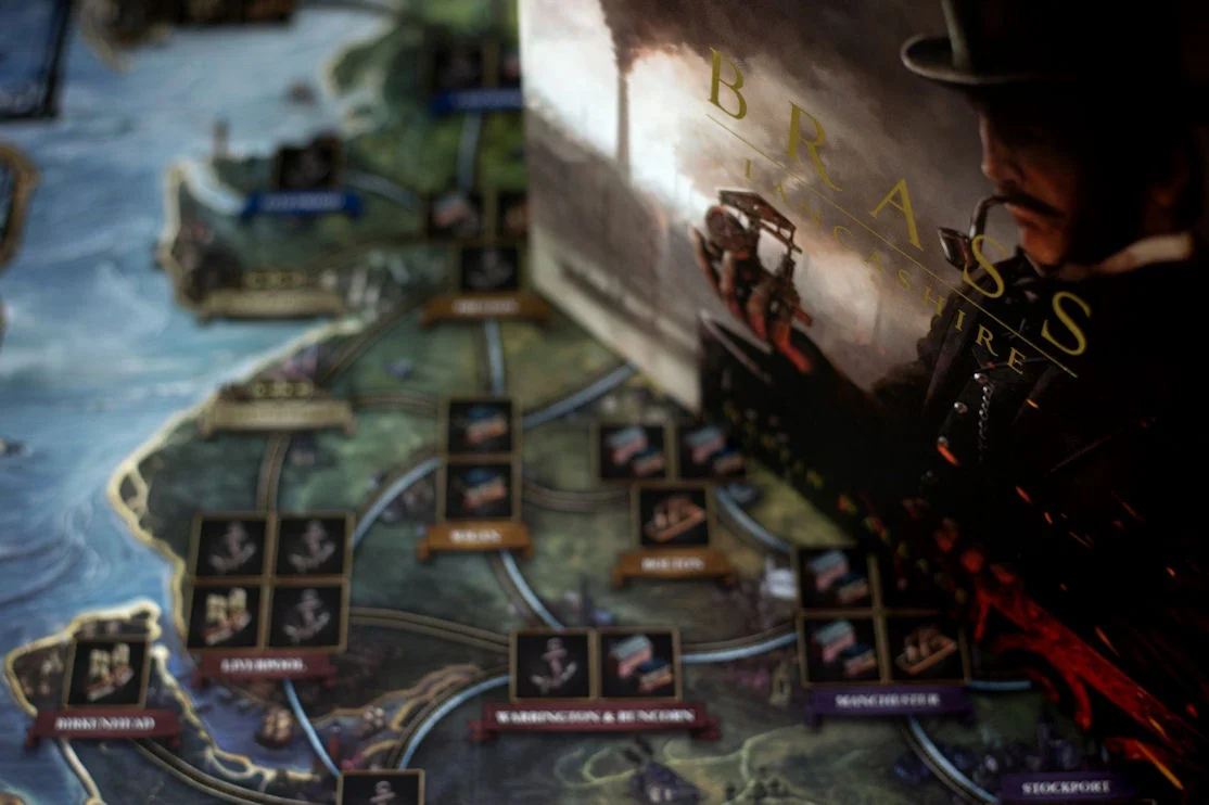 Brass: Lancashire — first published as Brass — is an economic strategy game that tells the story of competing cotton entrepreneurs in Lancashire during the industrial revolution. You must develop, build, and establish your industries and network so that you can capitalize demand for iron, coal and cotton. The game is played over two halves: the canal phase and the rail phase. To win the game, score the most victory points (VPs), which are counted at the end of each half. VPs are gained from your canals, rails, and established (flipped) industry tiles. Each round, players take turns according to the turn order track, receiving two actions to perform any of the following:
