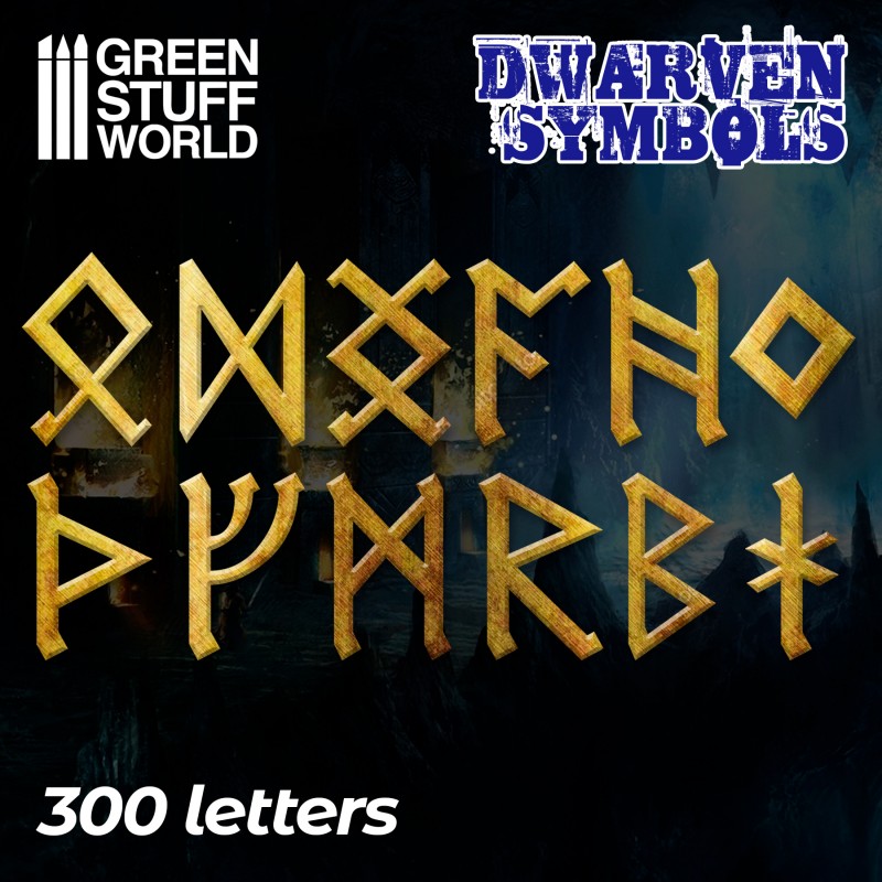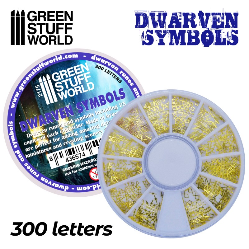 Collection of 300 dwarven or viking themed runes, symbols and signs made of brass. There are 12 different types to choose from, separated in different compartments. They are perfect for adding details to armour, weapons and banners of your models and miniatures or for decorating dioramas. We recommend using cyanocrylate glue in small quantities. Approximate thickness of characters: 0.26mm Size: 2-3mm Quantity: 300 characters (25 units of each character) NOTICE: Due to the small thickness and size of the pieces, some could come out of the separator disk, or change compartment.