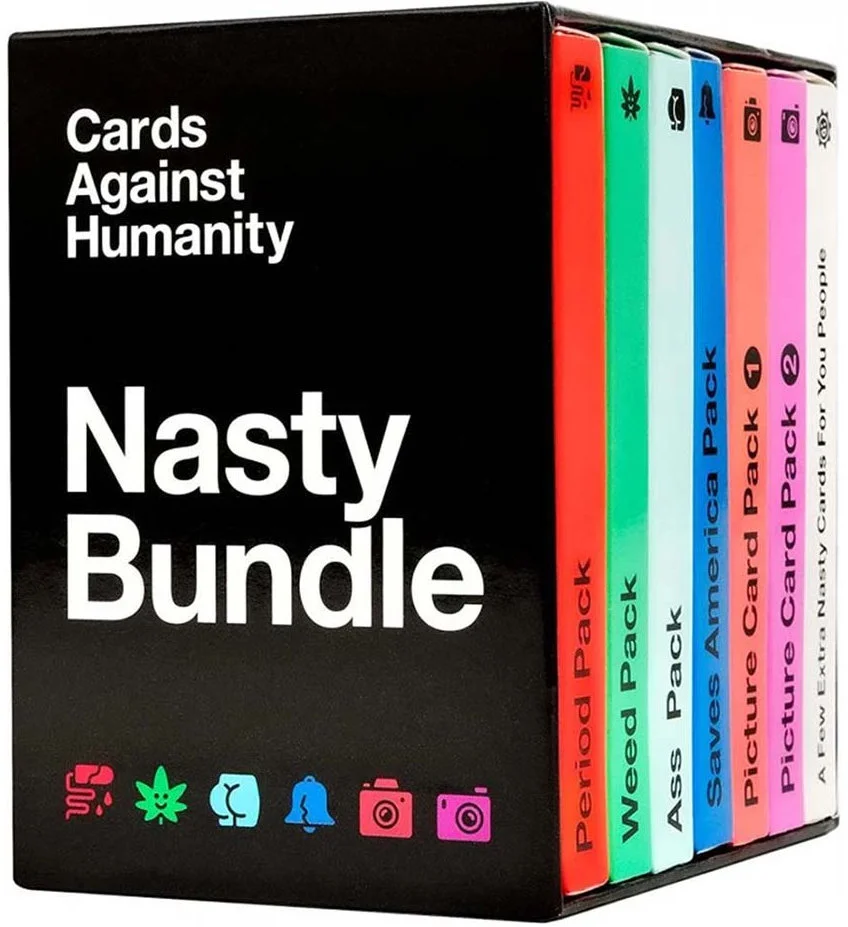The Nasty Bundle is a collection of six themed packs that's too spicy for most stores. Shuffle these into your deck and make everyone uncomfortable the next time you play! Comes with the Period Pack, Weed Pack, Ass Pack, Saves America Pack, Picture Card Pack 1, and Picture Card Pack 2. Also includes ten all-new extra-nasty cards we wrote just for you.