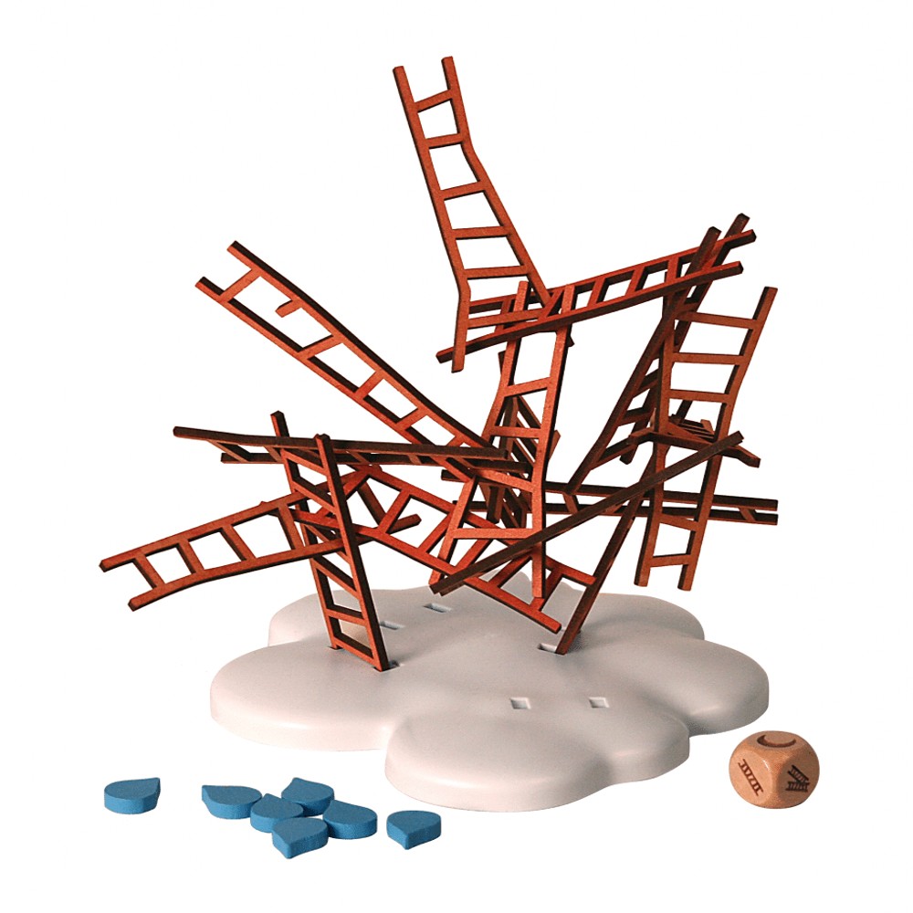 Roll the dice – place a ladder – catch the moon! Climb through the clouds and reach for the moon! All it takes is a few cleverly placed ladders, a steady hand, and a bit of imagination. Reach for the moon, but don't stretch yourself too thin, or you may lose the ladders under your feet. With the right mix of suspense and risk-taking, you will ascend to success. In this dexterity/stacking game with a whimsical theme and beautiful design, players take turns rolling a die to determine how they must place their wooden ladder (it must touch one other ladder, two other ladders, or be the highest point. Ladders will shift as more pieces are added, adding an element of suspense and unpredictability. Raindrops are given to players whose ladders cause the structure to collapse; the winner is the player with the least amount of raindrops at the end of the game!