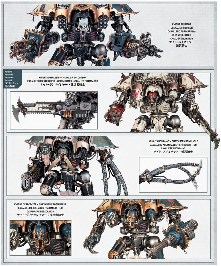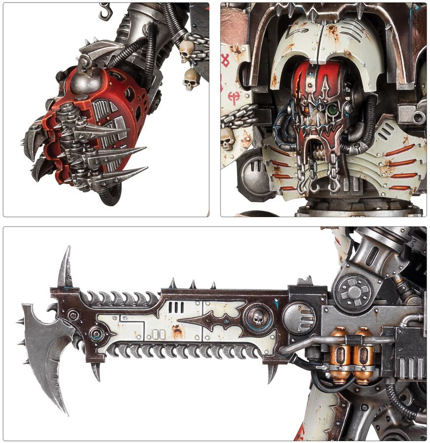 – Knight Desecrator, armed with desecrator laser destructor, diabolus heavy stubber, and either a reaper chainsword or a warpstrike claw