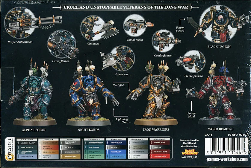 Förpackningen innehåller delar för att montera 5 Chaos Terminators som kan utrustas med en rad olika alternativa delar såsom vapen, det ingår bland annat: