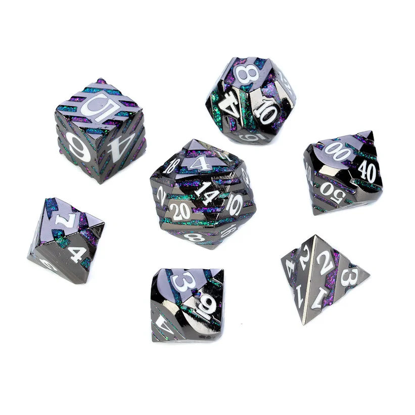 The Greifenfels Chevron Series are metal dice with glitter-filled grooves. This set contains 7 metal dice (D20,D12,D100 tens,D10,D8,D6,D4)