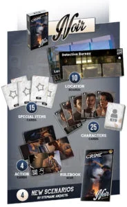 Noir is an expansion authored by Stephane Anquetil, a very talented writer with credentials including Sherlock Holmes Consulting Detective scenarios as well as Escape Books and Box (404 éditions). In Noir, the whole group is collectively representing one private detective with unconventional methods. Instead of Forensic Contacts, players have 4 action cards they can use at any point and any moment: Spy Break-In Bribe Intimidate You won't be able to intimidate everyone without repercussions. Also, your money is in a shortage, so you can't bribe everyone you meet. Noir really brings another side to crime busting! This Expansion requires the base game (London) to be played. It also requires an app to work (it's impossible to play without it), but once downloaded no Internet connection is needed to play. You currently need Android 4.4 or newer, or iOS 8.0 or newer to run the app, which may change in the future.