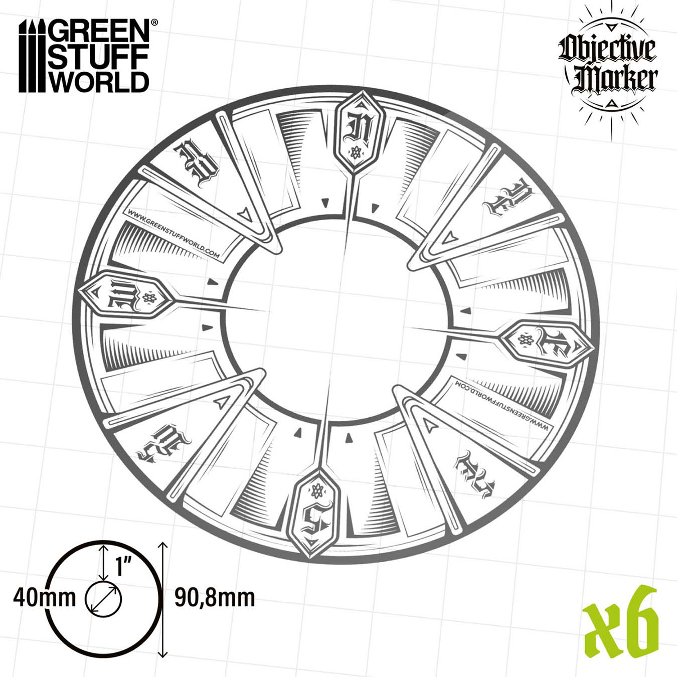 Dessa objective markers för Warhammer 40,000: Kill Team används för att tydligt markera kontrollzoner på spelbordet enligt aktuella uppdrag och turneringsformat.