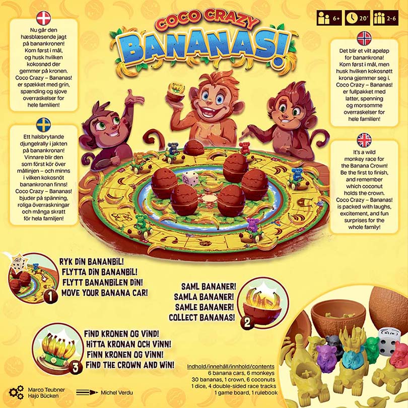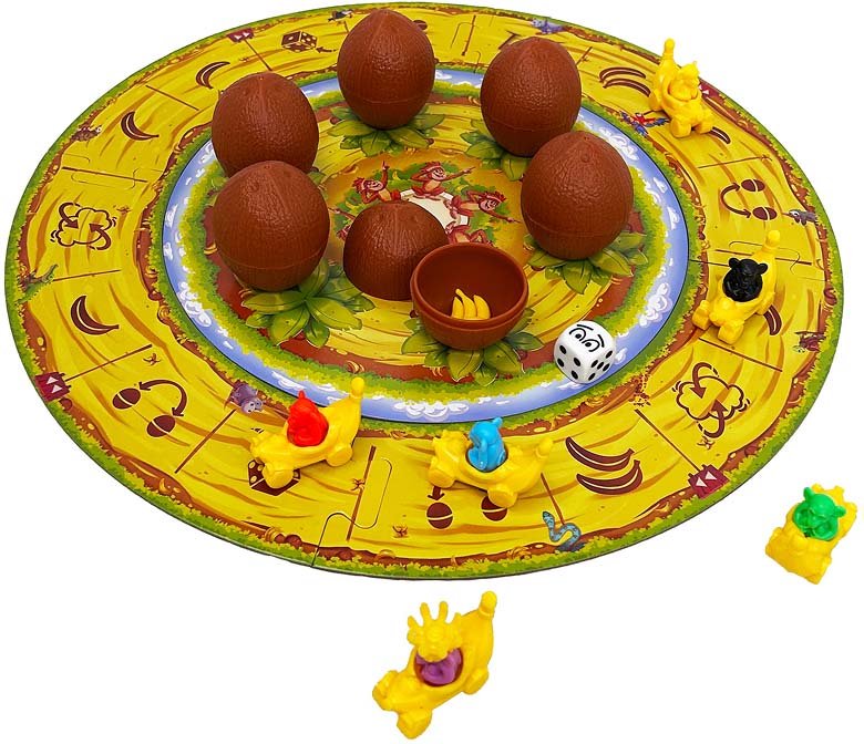 Slå tärningen och kör din coola bananbil. Rutan du landar på visar vad du får göra: samla bananer, byta kokosnötter eller till och med hemligt blanda dem för att förvirra dina motståndare!