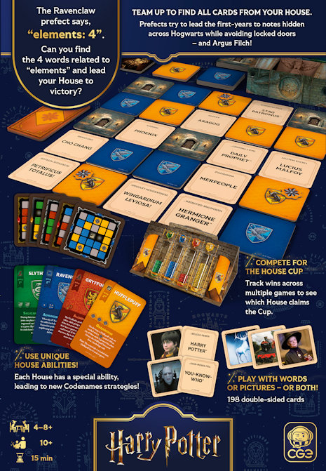 Codenames: Back to Hogwarts is an all new Codenames experience inspired by the Wizarding World. Team up and play the classic word association party game as your favorite Hogwarts houses, using distinct Gryffindor, Ravenclaw, Hufflepuff, and Slytherin-themed abilities to strategically gain an advantage for your side.
