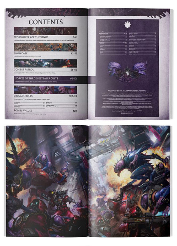 Boken innehåller inspirerande artwork och målade miniatyrer, samt fullständiga regler för att spela Genestealer Cults i Combat Patrol, Crusade och matched play i Warhammer 40,000.