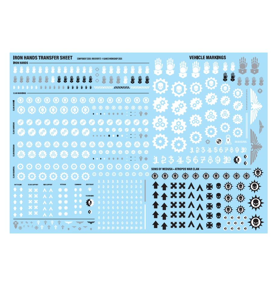 This kit is supplied with a brand new Iron Hands Transfer Sheet, containing 468 high-quality waterslide transfers. These include Chapter icons for the Iron Hands, battlefield role icons, and numbers. They also include iconography for the Atropos War Clan of the Sons of Medusa, Clan Avernii, Clan Garrsak, Clan Raukaan, and Clan Kaargul.