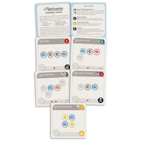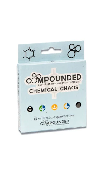 Compounded is a game about building chemical compounds through careful management of elements, a fair bit of social play and trading, and just a bit ok luck. In Compounded, players take on the roles of lab managers, hastily competing to complete the most compounds before they are completed by others - or destroyed in an explosion. Compounded: Chemical Chaos is an expansion of the game Compounded that includes new compounds and an additional Lab Fire card. CONTENTS -15 cards