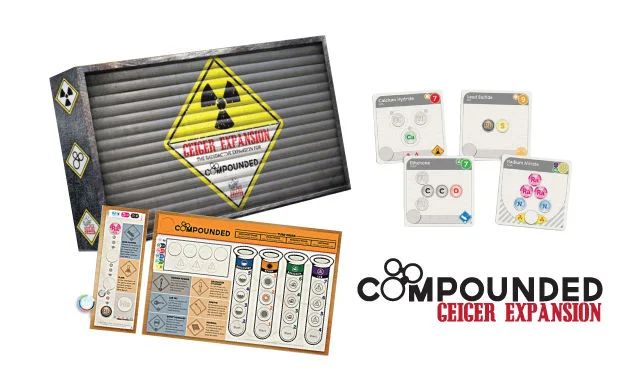 The Geiger Expansion introduces a new, interactive paradigm to the base game of Compounded as players now sometimes have to work together to eliminate or reduce the threat of radioactivity. As productivity in the lab increases, so does the chance for radioactivity levels to rise. Scientists have to keep a close eye on the geiger counter or else risk the lab becoming too radioactive in which to work. Of course, those players with a propensity for causing chaos have even more methods at their disposal, ensuring that each game is exciting and dynamic. CONTENTS -15 cards