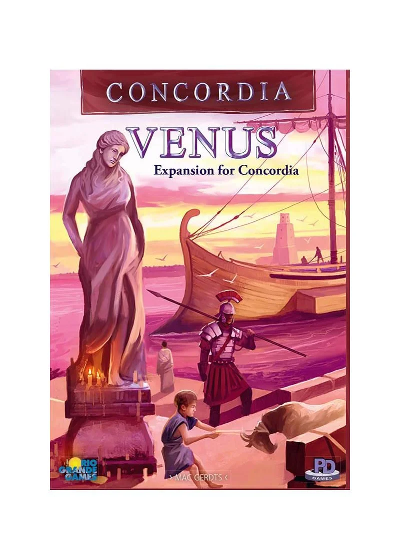 With the help of Venus, the goddess of love and intimacy, two partners work together at a game of Concordia while competing against one or two other teams. Mutual understanding and coordinated planning are essential to succeed as a harmonious couple. Venus also off ers a challenging new game variant for 2 to 5 individual players. With additional game material for a sixth player and new game boards, Concordia Venus can be integrated with the base game and all previous Concordia expansions, including Salsa. 45-90 min 2-5 players 13+