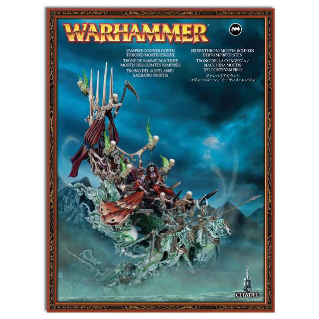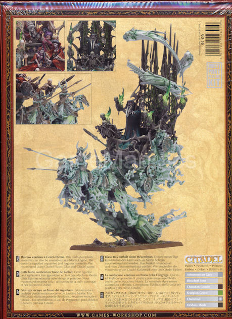 This enormous multi-part plastic kit contains 87 components and a Citadel 120x92mm Oval base with which to build one Mortis Engine, a Coven Throne or a Bloodseeker Palanquin.