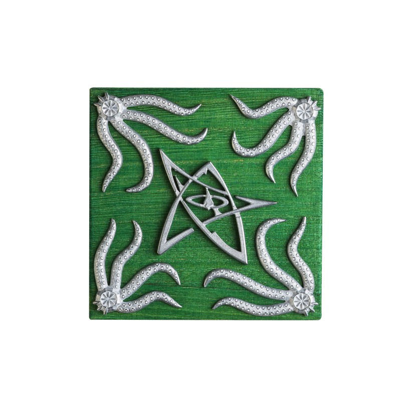 This is wooden (not plywood!) handcrafted box, covered with metal reliefs of tentacles and mouths of madness with beautiful green paint. On the center of the box there is a metal relief of the Elder Sign attached, precisely cut by unspeakable forces.