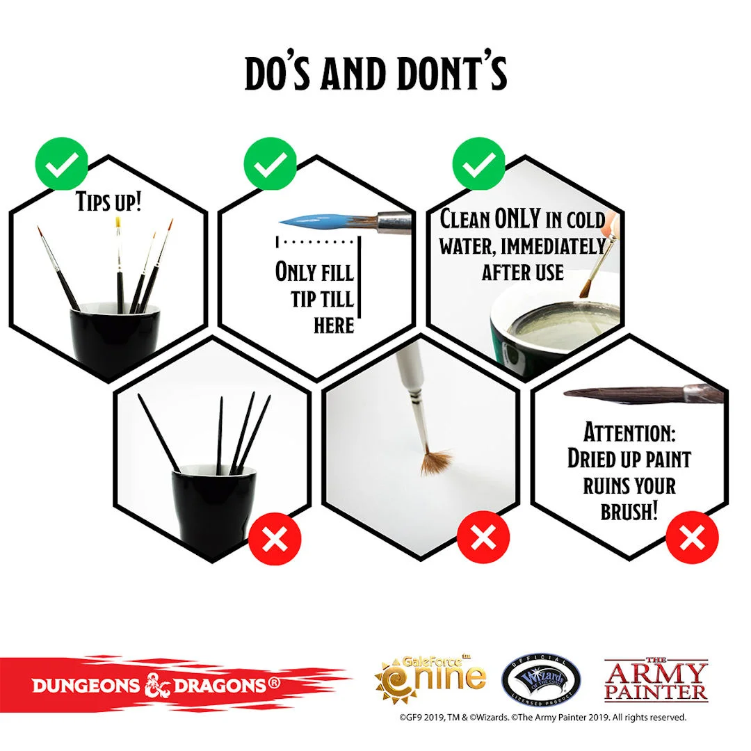 Even with Nolzur’s Marvelous Pigments, applying any type of paint is often done best with a brush. The Dungeons & Dragons brush set contains 3 fantastic brushes – each selected for a special purpose and combined they make a perfect starter selection for any painter. Nolzur says: 'I myself started with magical brushes like these, before I invented my Marvelous Pigments!' BASECOAT BRUSH This brush is used for basecoating miniatures. The size is perfect for administering colours in the right places without “drowning” the model in paint. DETAIL BRUSH This brush is used for adding tiny details to your miniatures such as eyes, tattoos, belt buckles, etc. The sharp point also enables you to make tiny black outlines between your base colours. DRYBRUSH This is the brush used for drybrushing. To drybrush: use a lighter colour than your basecoat, then apply paint to your drybrush and wipe the excess paint off using a cloth/tissue. Move the brush quickly back and forth over the raised areas to get the effect.