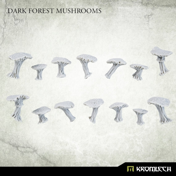 This set contains 14 high quality resin Dark Forest Mushrooms that can be used to decorate miniatures, bases or scenery. Designed to fit 28mm heroic scale. Mushrooms have between 7 mm to 12 mm height. Supplied unassembled and unpainted.