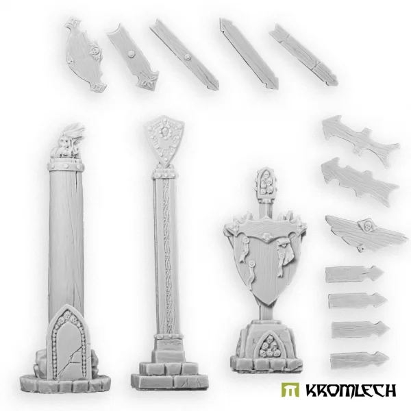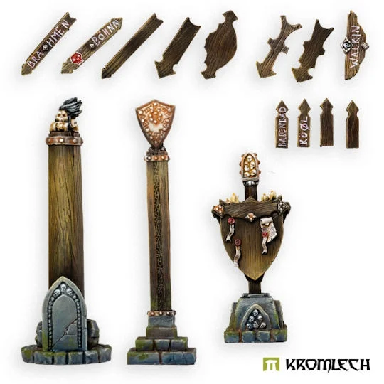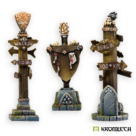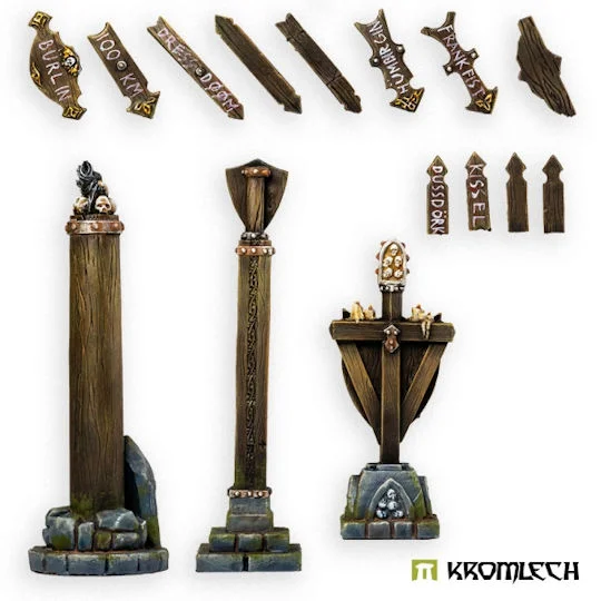 As the Dark Forest is spreading, consuming more and more lands around it, several trade routes and smaller roads have been reintroduced the wilderness. There is still something oddly unsettling in finding such a roadsign leading to nowhere in the middle of the forest. This set contains three high quality resin models of Dark Forest Signposts. Designed to fit 28mm heroic scale wargames.