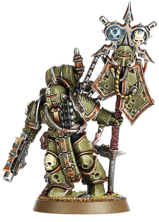 Denna krigare släpar sitt tecken av förtvivlan in i striden – en ikon formad efter Nurgles symbol, dekorerad med kranium och hjälm. Från hans rustning hänger även ett ruttnande avhugget huvud, en dyster påminnelse om vad som väntar hans motståndare. Under ikonens skugga drivs hans stridsbröder att kämpa vidare med obeveklig uthållighet.