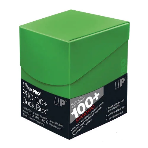 Ultra PRO's Eclipse PRO 100+ Deck boxes are compact and convenient ways to hold up to 110 standard-sized cards in Deck Protector sleeves. Each durable card storage box is equipped with a self-locking lid design with a built-in thumb notch for easy access to your cards (sleeves, cards not included.) PRO-100+ Deck Box to store and protect your valuable decks. Made with archival-safe, non-PVC rigid polypropylene material. A self-locking lid keeps cards from falling out. Thumb-notch on lid allows easy opening without sacrificing security.