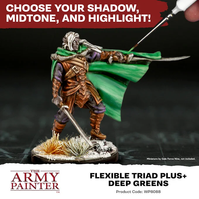 The Flexible Colour Triad System is a segment, or family, of six colours that range from dark to light with a consistent hue. This system allows you to easily select paints that create a natural colour progression on your miniatures. This paint set features not only the complete Deep Greens Triad, but also comes with a seventh complimenting colour, Blighted Green, designed with John Blanche for the Masterclass Series by The Army Painter.