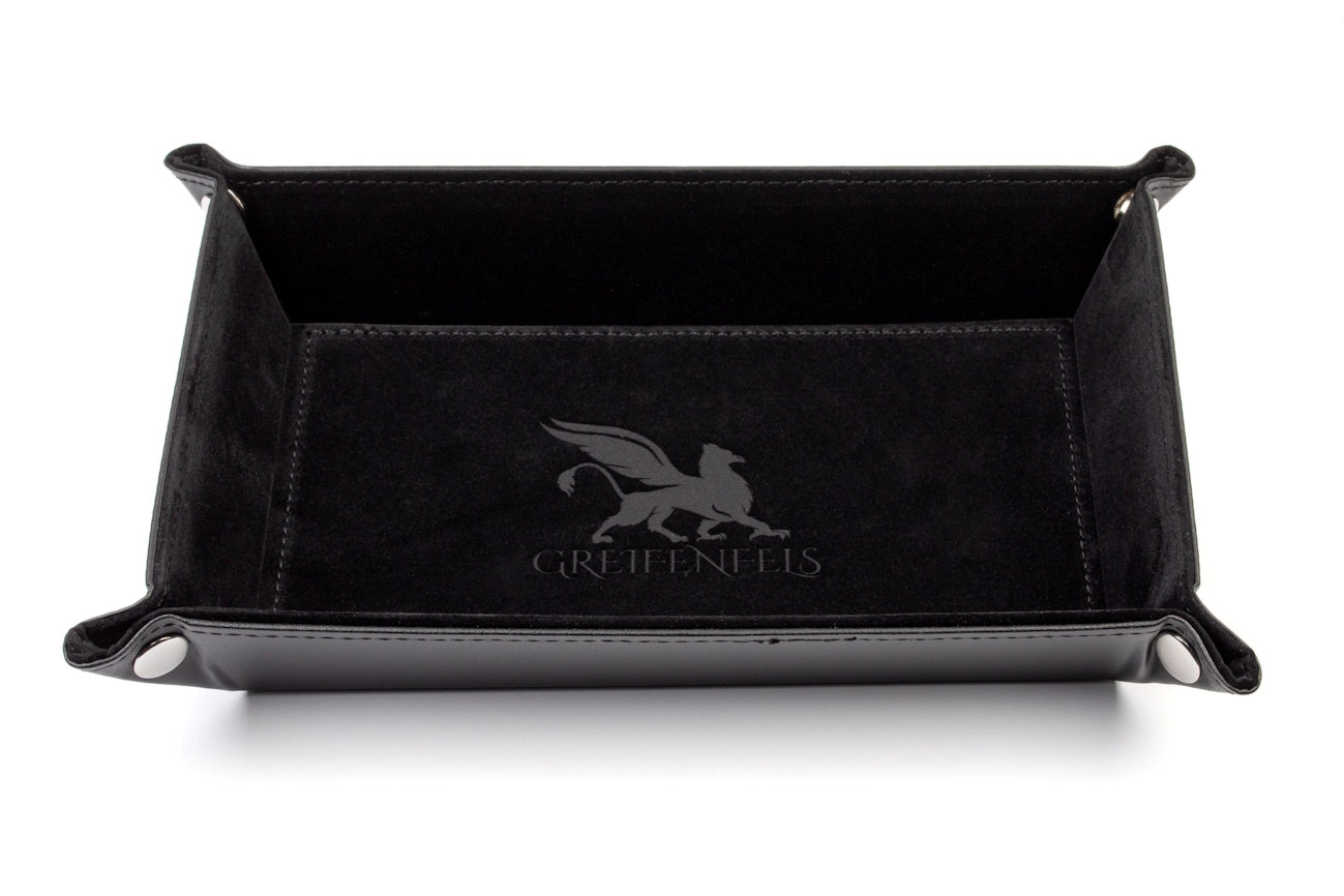 Greifenfels Dice trays are made with velvet and PU leather. When flat our rectangle series is 27cm * 19cm and fits nicely into a A-4 binder.