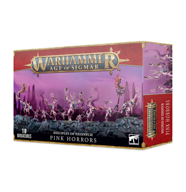 This set contains ten multi-part, multi-limbed plastic Pink Horrors. This set includes all of the components needed to assemble a hornblower, an icon bearer (with immense, flaming Tzeentchian icon) and an Iridescent Horror.