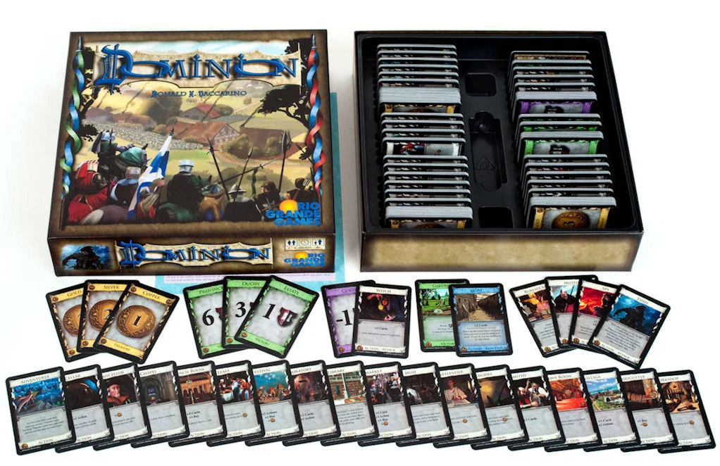 You are a monarch, like your parents before you, a ruler of a small pleasant kingdom of rivers and evergreens. Unlike your parents, however, you have hopes... dreams! You want a bigger kingdom, more pleasant, with more rivers, and a wider variety of trees. You want a Dominion ! In all directions lie fiefs, freeholds, and feodums. All are small bits of land, controlled by petty lords and verging on anarchy. You will bring civilization to these people, uniting them under your banner. But wait! It must be something in the air; several other monarchs have had the exact same idea. You must race to get as much of the unclaimed land as possible, fending them off along the way. To do this you will hire minions, construct buildings, spruce up your castle, and fill the coffers of your treasury. Your parents wouldn’t be proud, but your grandparents, on your mother’s side, would be delighted. This is a game of building a deck of cards. The deck contains your resources, victory points, and the things you can do. It starts out a small sad collection of Estates and Coppers, but you hope that by the end of the game it will be brimming with Gold, Provinces, and the inhabitants and structures of your kingdom. This is the second edition of Dominion . Six cards were replaced and one added compared to the first edition. The base cards have art now, and the trash has a mat.
