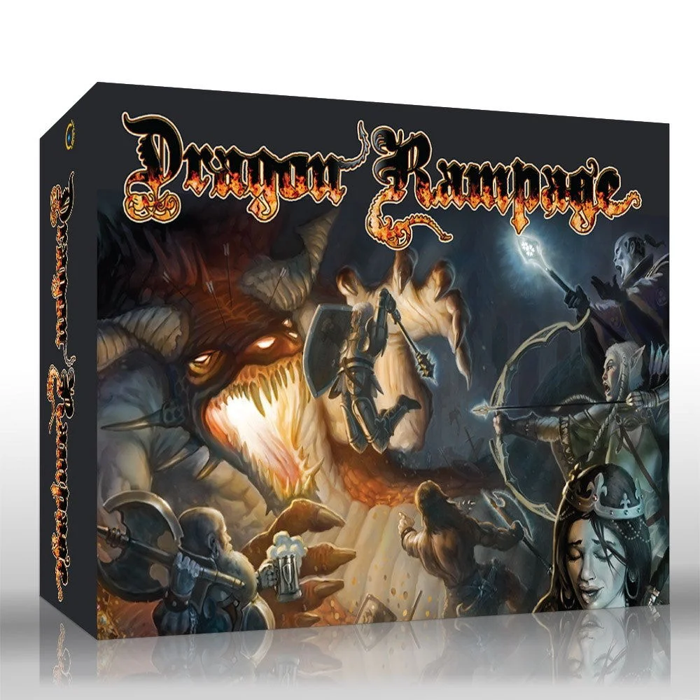 Dragon Rampage is a strategic dice game where each player takes the role of an adventurer, each with different abilities, and tries to score the most points at the end of the game by fighting against, or running from (or some combination of the two), the dragon you just woke up and tallying up the treasure and gold you obtain in the dungeon. Players roll 7 specially designed dice, and can choose whether to focus on grabbing treasure (from the dragon or from another player), fighting the dragon, protecting themselves and their treasure, or running for the exit. Try not to draw the dragon¡¦s attention as you make your way, and note that your fellow adventurers may hinder (or aid) you in your strategy and that the final scoring changes depending on how the game ends, so watch your back! Designed by Richard Launius Artwork by Cyril van der Haegen