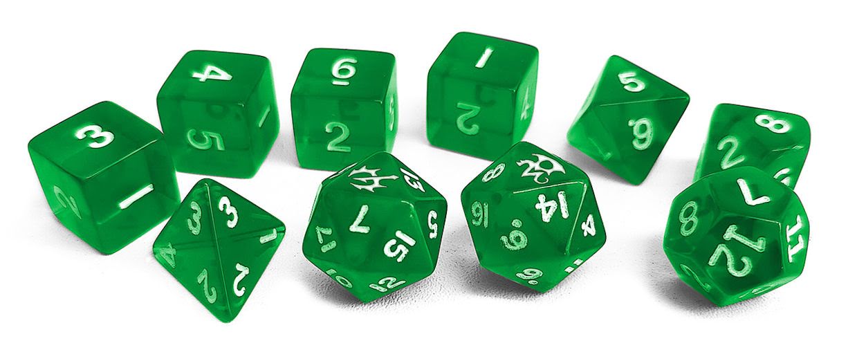 Ett set genomskinliga tärningar innehållande en vardera av T4, T6, T8, T10, T12 och T20. Den sistnämnda har specialsymboler på sidorna 1 och 20 för att markera drakslag och demonslag i Drakar och Demoners spelregler.