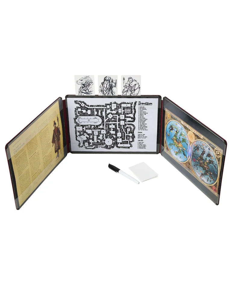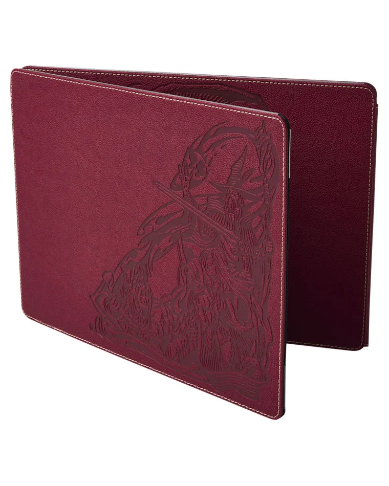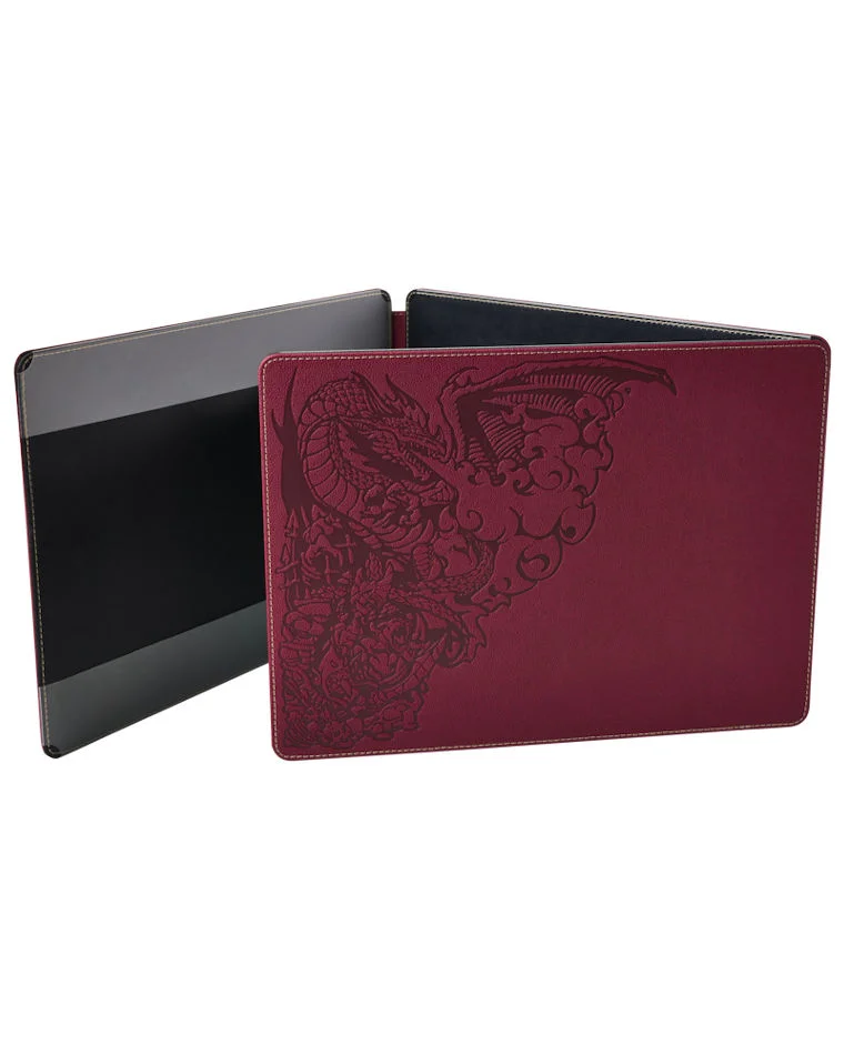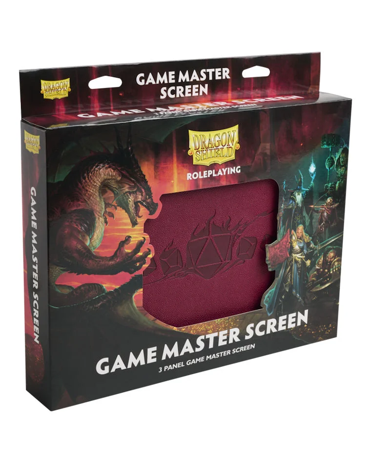 Let epic stories unfold as brave adventurers dive into your world of grand quests and exploration. Never lose track of turn order and oversee your secret notes as the plot thickens behind this elegant customizable Game Master Screen. The integrated initiative tracker lets you streamline combat sessions with clearly visible initiative order for the whole table. Use the included cards and dry erase marker to create PC, NPC and monster cards. The Game Master Screen sits at a pleasant ergonomic height giving you a comfortable view of the adventures that unfold even while seated, ample space for sheltering reference notes, rules, maps and more behind the screen. Includes: Dragon Shield mini adventure 18 reusable plastic cards and dry erase marker Features: Ergonomic height Integrated initiative tracker Subtle and elegant embossing Panels hold letter and A4 size paper Durable blood red Dragon Skin exterior The GM screen’s dimensions when open straight are 96 by 23 cm (37.8 x 9"). Measures 13.5 x 23 x 1.7 cm (5.3 x 9 x 0.7") when folded shut.