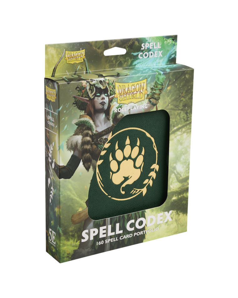 Experience the feel of flipping through a mythical spell book, channeling nature’s raw magical energy and casting powerful spells. Take your game immersion to the next level. Stay in control and never lose track of your remaining spell slots with the included 5e spell slot tracker and dry erase marker. The Spell Codex is compatible with official DnD spell cards and accommodates 160 spells. Featuring a deep Forest Green Dragon Skin cover with graceful druidic embossing on the front and spine. Go on some light questing with the included free 5e compatible mini adventure. Features: Secure magnetic clasp Room for 160 spell cards Compatible with official DnD spell cards Dry erase marker and 5e compatible spell slot tracker included Durable and elegant Dragon Skin exterior with golden druidic embossing Without cards the Spell Codex measures 21.7 x 18.8 x 3cm (8.54 x 7.4 x 1.2")