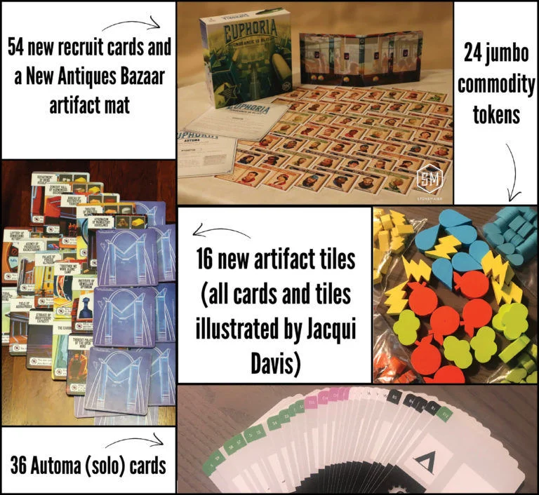 In Euphoria: Build a Better Dystopia, you lead a team of workers (dice) and recruits (cards) to claim ownership of the dystopian world. You will generate commodities, dig tunnels to infiltrate opposing areas, construct markets, collect artifacts, strengthen allegiances, and fulfill secret agendas.