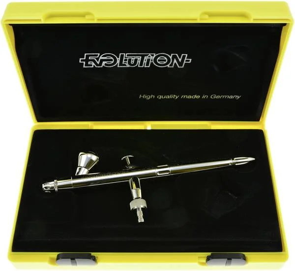 The Evolution Silverline combines all the advantages of the Evolution with a slim silver design, solvent-resistant middle section and innovative paint volume control. Thanks to the complete metal design, paints containing solvents can also be used without any difficulties. Paint volume control enables individual adjustment of the lever mechanism, thus facilitating particularly fine work.