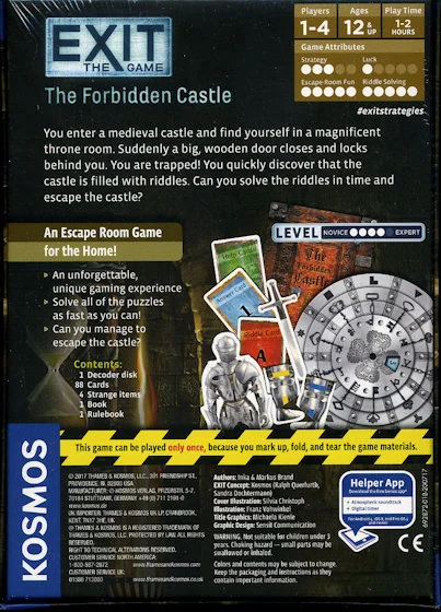 Finally, a vacation! Sifting through brochures for local events and attractions, you discover an impressive, medieval castle that`s just dying to be explored. But, upon entering, the massive, wooden door locks behind you! The castle is full of mysteries - can you solve all of the puzzles in time to escape this tourist trap! Exit: The Game brings the hit Escape-Room concept for home use! In this party game for up to six players, you must solve a series of riddles and puzzles to escape.