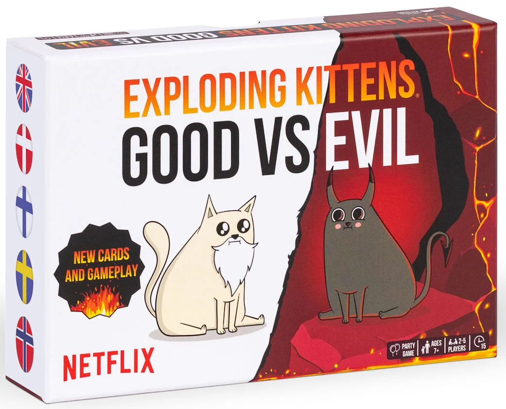 Nya regler. Nya katter. Nytt kaos. DEn här versionen av Exploding Kittens presenterar nya kort och regler för den animerade serien Exploding Kittens känd från Netflix. I sin grund är det fortfarande det strategiska spelet i stil med rysk roulette som vi har lärt känna och älska fast med nya Armageddon-kort som bygger upp till en episk strid mellan gott och ont. Var smartare än din motståndare. Undvik att sprängas i luften. Den som överlever alla andra vinner! 2-5 7+ 15 min