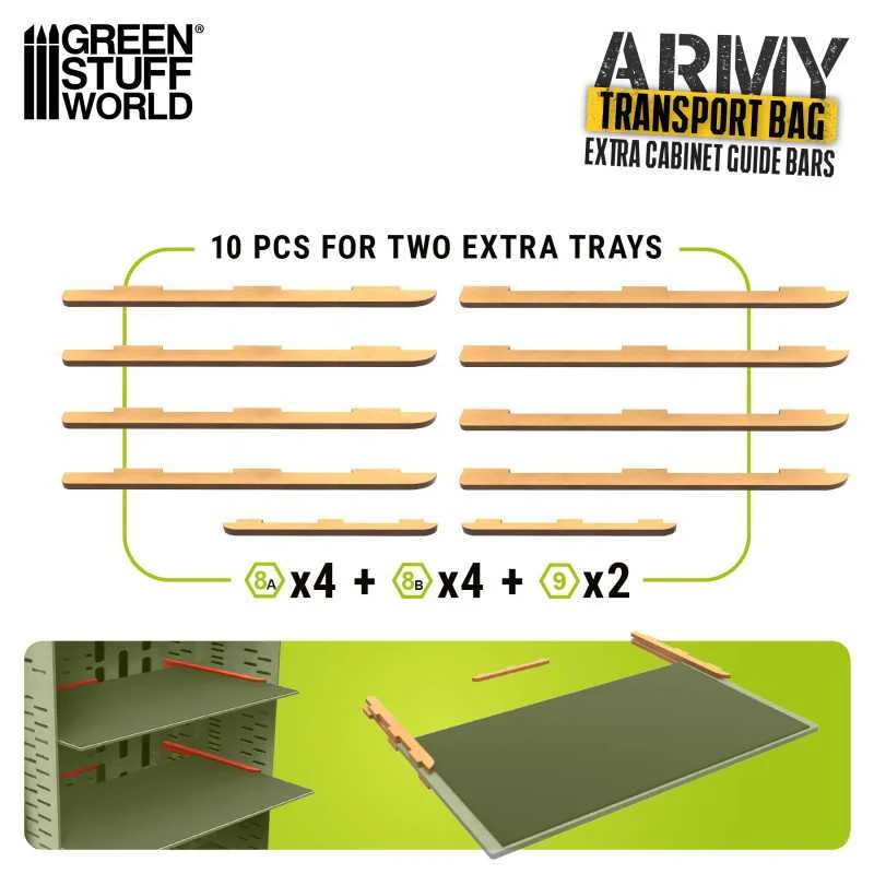 Extra rails to create new heights in your Miniatures Carrying Case or extra cabinet, providing more space to organize and protect your miniatures safely during transport. With them, you can maximize the usefulness of your case, ensuring that all your figures are perfectly in place and protected from damage during travel.