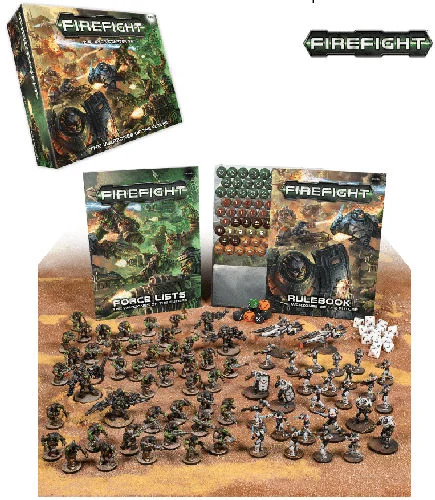 Contents: 40x Marauder Commandos/Brawlers, 4x Marauder Ripper Suits, 20x Enforcers, 5x Enforcer Peacekeepers, 2x Enforcer Jetbikes, 1x Firefight Rulebook, 1x Firefight Force Lists Book, 2x Card Counter Sheets, 1x Getting Started guide, 16x D8, 11x Firefight, Command Dice, 9x 40mm Bases, 62x 25mm Round Bases.